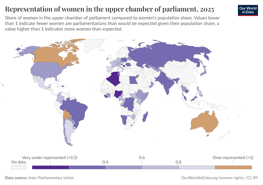 “Data Page: Representation of women in the upper chamber of parliament”. Our World in Data (2026). Data adapted from Inter-Parliamentary Union. Retrieved from https://archive.ourworldindata.org/20260105-133053/grapher/representation-of-women-in-the-upper-chamber-of-parliament.html [online resource] (archived on January 5, 2026).