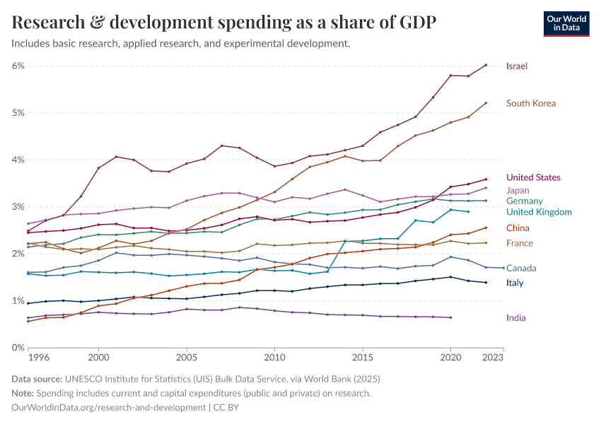 “Data Page: Research & development spending as a share of GDP”. Our World in Data (2025). Data adapted from UNESCO Institute for Statistics (UIS) Bulk Data Service, via World Bank. Retrieved from https://archive.ourworldindata.org/20250916-102301/grapher/research-spending-gdp.html [online resource] (archived on September 16, 2025).How to cite this data