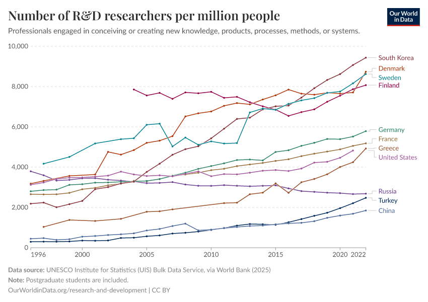 “Data Page: Number of R&D researchers per million people”. Our World in Data (2025). Data adapted from UNESCO Institute for Statistics (UIS) Bulk Data Service, via World Bank. Retrieved from https://archive.ourworldindata.org/20250916-102301/grapher/researchers-in-rd-per-million-people.html [online resource] (archived on September 16, 2025).How to cite this data