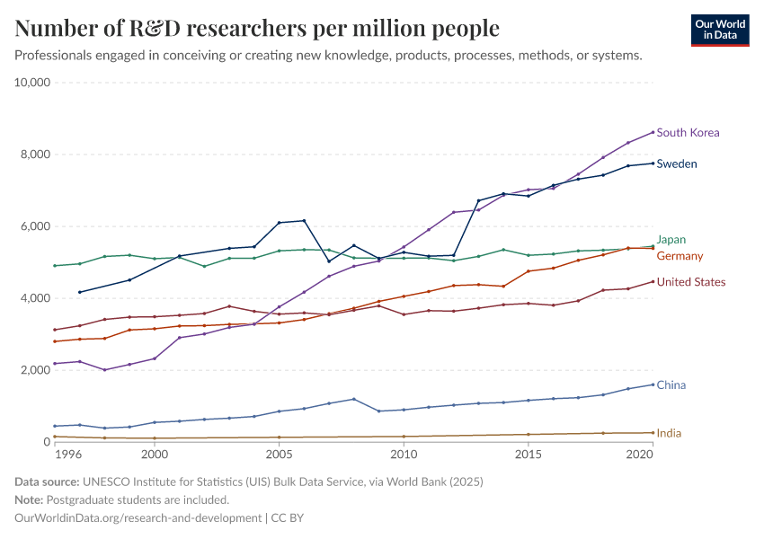 “Data Page: Number of R&D researchers per million people”. Our World in Data (2025). Data adapted from UNESCO Institute for Statistics (UIS) Bulk Data Service, via World Bank. Retrieved from https://archive.ourworldindata.org/20250916-102301/grapher/researchers-in-rd-per-million-people.html [online resource] (archived on September 16, 2025).How to cite this data
