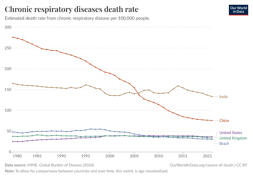 IHME, Global Burden of Disease (2024) – with minor processing by Our World in Data. “Chronic respiratory diseases death rate” [dataset]. IHME, Global Burden of Disease, “Global Burden of Disease - Deaths and DALYs” [original data]. Retrieved December 21, 2025 from https://archive.ourworldindata.org/20250909-093708/grapher/respiratory-disease-death-rate.html (archived on September 9, 2025).