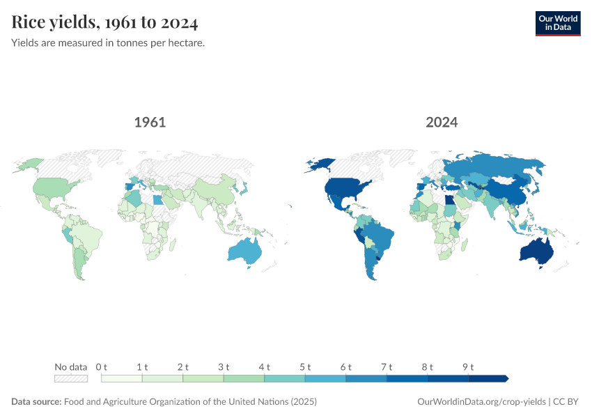 “Data Page: Rice yields”, part of the following publication: Hannah Ritchie, Pablo Rosado, and Max Roser (2023) - “Agricultural Production”. Data adapted from Food and Agriculture Organization of the United Nations. Retrieved from https://archive.ourworldindata.org/20260304-094028/grapher/rice-yields.html [online resource] (archived on March 4, 2026).How to cite this data