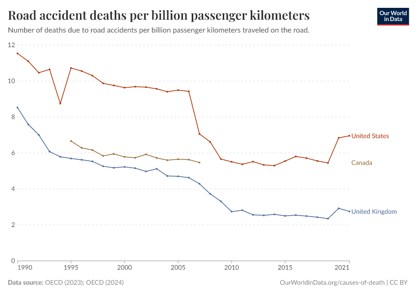“Data Page: Road accident deaths per billion passenger kilometers”, part of the following publication: Hannah Ritchie and Max Roser (2021) - “Transport”. Data adapted from OECD. Retrieved from https://archive.ourworldindata.org/20250909-093708/grapher/road-accident-deaths-per-passenger-kilometers.html [online resource] (archived on September 9, 2025).How to cite this data