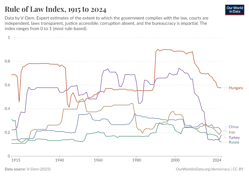 V-Dem (2025) – processed by Our World in Data. “Rule of Law index – V-Dem” [dataset]. V-Dem, “Democracy report v15” [original data]. Retrieved December 30, 2025 from https://archive.ourworldindata.org/20251209-133038/grapher/rule-of-law-index.html (archived on December 9, 2025).