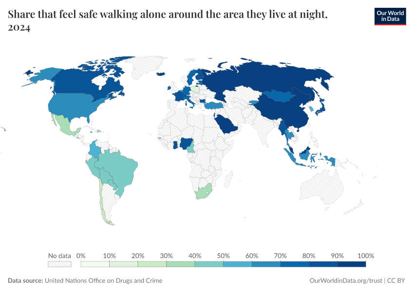 United Nations Office on Drugs and Crime – processed by Our World in Data. “Share that feel safe walking alone around the area they live at night” [dataset]. United Nations Office on Drugs and Crime, “Data from multiple sources” [original data]. Retrieved April 5, 2026 from https://archive.ourworldindata.org/20260304-094028/grapher/safety-walking-alone.html (archived on March 4, 2026).Download
