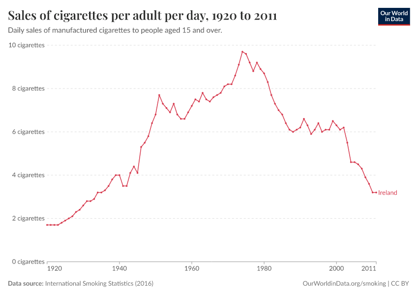 “Data Page: Manufactured cigarette sales per adult per day”, part of the following publication: Hannah Ritchie and Max Roser (2023) - “Smoking”. Data adapted from Forey et al.. Retrieved from https://archive.ourworldindata.org/20250909-093708/grapher/sales-of-cigarettes-per-adult-per-day.html [online resource] (archived on September 9, 2025).How to cite this data