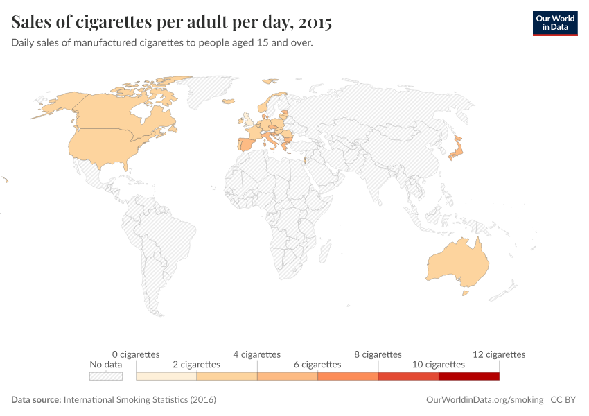 “Data Page: Manufactured cigarette sales per adult per day”, part of the following publication: Hannah Ritchie and Max Roser (2023) - “Smoking”. Data adapted from Forey et al.. Retrieved from https://archive.ourworldindata.org/20260304-094028/grapher/sales-of-cigarettes-per-adult-per-day.html [online resource] (archived on March 4, 2026).