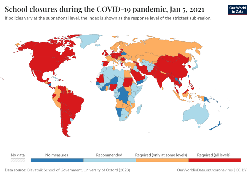 Blavatnik School of Government, University of Oxford (2023) – with minor processing by Our World in Data. “School closures during the COVID-19 pandemic” [dataset]. Blavatnik School of Government, University of Oxford, “Government Response Tracker (OxCGRT)” [original data]. Retrieved December 27, 2025 from https://archive.ourworldindata.org/20250909-093708/grapher/school-closures-covid.html (archived on September 9, 2025).
