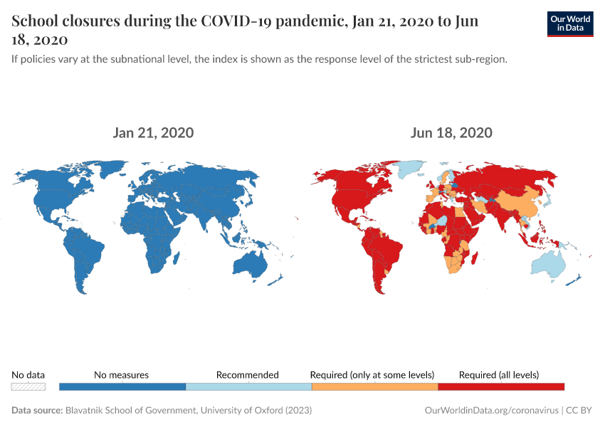 Blavatnik School of Government, University of Oxford (2023) – with minor processing by Our World in Data. “School closures during the COVID-19 pandemic” [dataset]. Blavatnik School of Government, University of Oxford, “Government Response Tracker (OxCGRT)” [original data]. Retrieved December 8, 2025 from https://archive.ourworldindata.org/20250909-093708/grapher/school-closures-covid.html (archived on September 9, 2025).