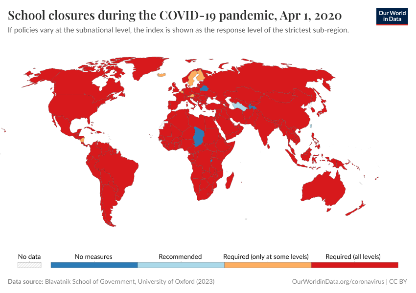Blavatnik School of Government, University of Oxford (2023) – with minor processing by Our World in Data. “School closures during the COVID-19 pandemic” [dataset]. Blavatnik School of Government, University of Oxford, “Government Response Tracker (OxCGRT)” [original data]. Retrieved December 8, 2025 from https://archive.ourworldindata.org/20250909-093708/grapher/school-closures-covid.html (archived on September 9, 2025).