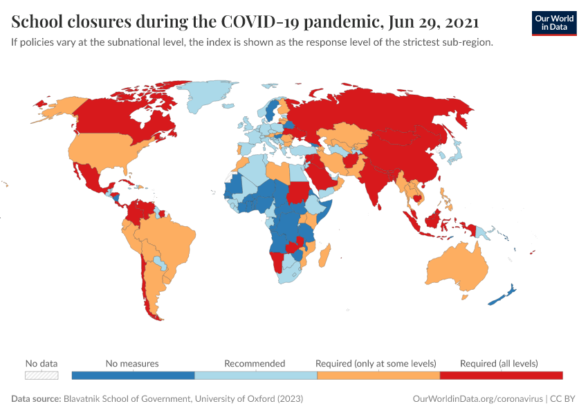Blavatnik School of Government, University of Oxford (2023) – with minor processing by Our World in Data. “School closures during the COVID-19 pandemic” [dataset]. Blavatnik School of Government, University of Oxford, “Government Response Tracker (OxCGRT)” [original data]. Retrieved December 19, 2025 from https://archive.ourworldindata.org/20250909-093708/grapher/school-closures-covid.html (archived on September 9, 2025).