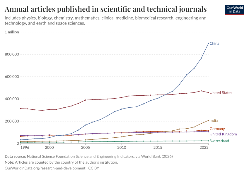“Data Page: Annual articles published in scientific and technical journals”. Our World in Data (2026). Data adapted from National Science Foundation Science and Engineering Indicators, via World Bank. Retrieved from https://archive.ourworldindata.org/20260417-112857/grapher/scientific-and-technical-journal-articles.html [online resource] (archived on April 17, 2026).How to cite this data