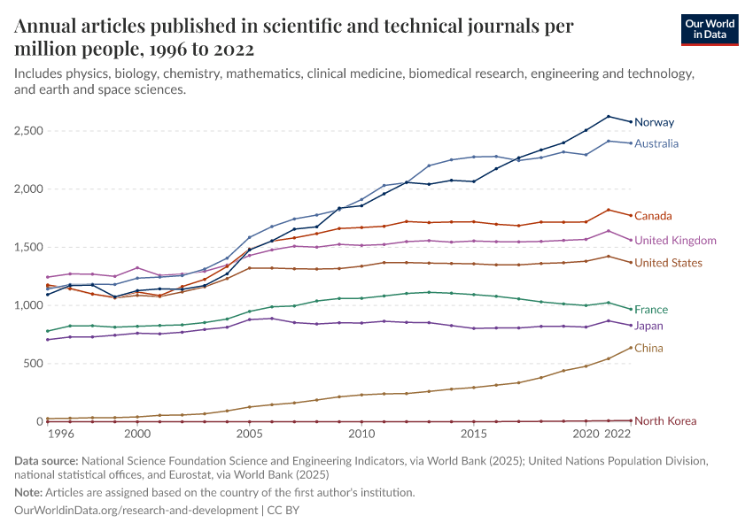 “Data Page: Annual articles published in scientific and technical journals per million people”, part of the following publication: Hannah Ritchie, Edouard Mathieu, and Max Roser (2023) - “Research and Development”. Data adapted from National Science Foundation Science and Engineering Indicators, via World Bank, United Nations Population Division, national statistical offices, and Eurostat, via World Bank. Retrieved from https://archive.ourworldindata.org/20251220-152415/grapher/scientific-publications-per-million.html [online resource] (archived on December 20, 2025).