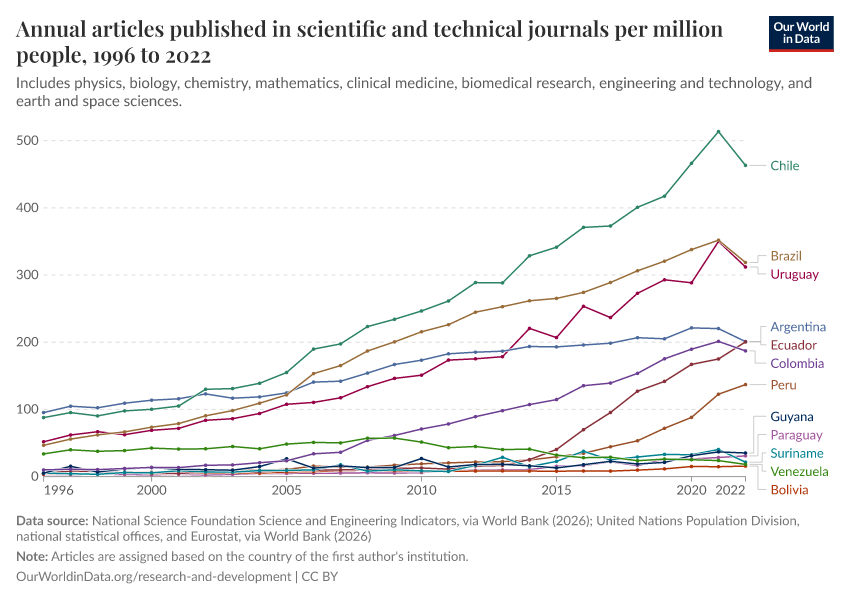 National Science Foundation Science and Engineering Indicators, via World Bank (2026); United Nations Population Division, national statistical offices, and Eurostat, via World Bank (2026) – processed by Our World in Data. “Annual articles published in scientific and technical journals per million people” [dataset]. National Science Foundation Science and Engineering Indicators, via World Bank, “World Development Indicators 125”; United Nations Population Division, national statistical offices, and Eurostat, via World Bank, “World Development Indicators 125” [original data]. Retrieved February 10, 2026 from https://archive.ourworldindata.org/20260202-181317/grapher/scientific-publications-per-million.html (archived on February 2, 2026).
