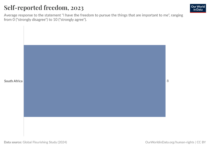 Average of responses of how much the respondent agreed with the statement that they have the freedom to pursue the things that are important to them, ranging from 0 ("strongly disagree") to 10 ("strongly agree").