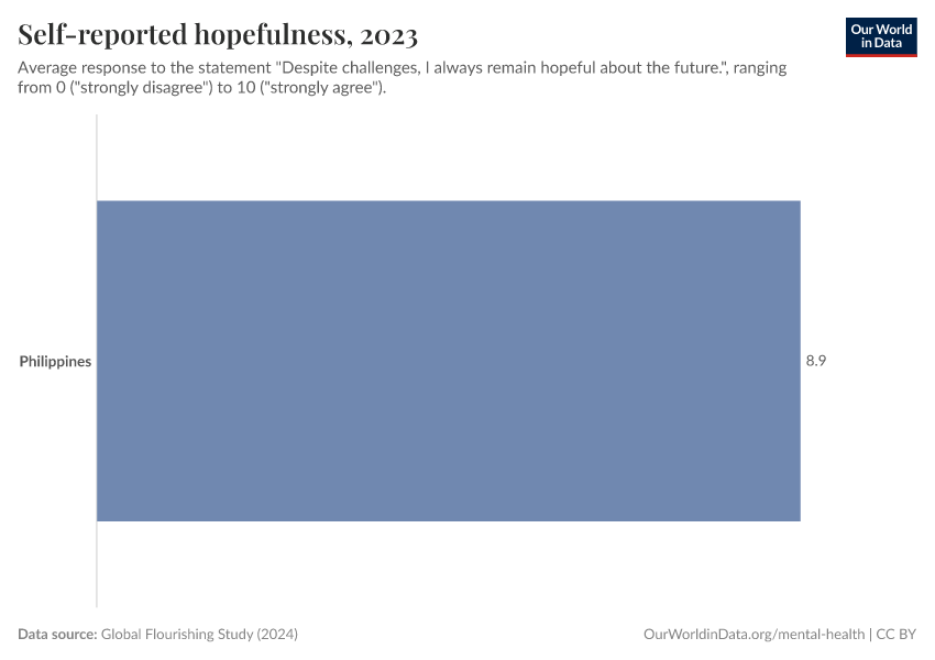 Average of responses of how much the respondent agreed with the statement that, despite challenges, they always remain hopeful about the future, ranging from 0 ("strongly disagree") to 10 ("strongly agree").