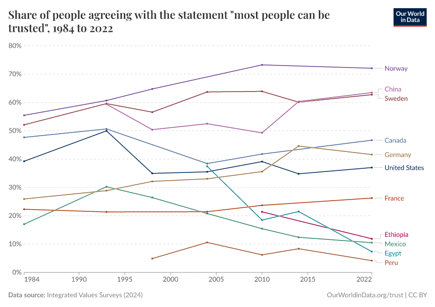 Integrated Values Surveys (2024) – with major processing by Our World in Data. “Share of people agreeing with the statement "most people can be trusted" – Integrated Values Surveys” [dataset]. Integrated Values Surveys, “Integrated Values Surveys (IVS) Version 4” [original data]. Retrieved December 18, 2025 from https://archive.ourworldindata.org/20250909-093708/grapher/self-reported-trust-attitudes.html (archived on September 9, 2025).