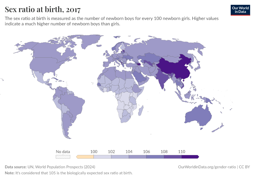 “Data Page: Sex ratio, at birth”. Our World in Data (2025). Data adapted from United Nations. Retrieved from https://archive.ourworldindata.org/20251209-133038/grapher/sex-ratio-at-birth.html [online resource] (archived on December 9, 2025).How to cite this data