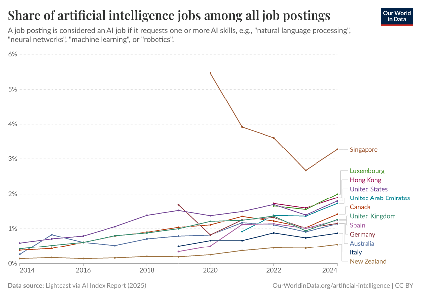 Lightcast via AI Index Report (2025) – with minor processing by Our World in Data. “Share of artificial intelligence jobs among all job postings” [dataset]. Lightcast via AI Index Report, “AI Index Report” [original data]. Retrieved December 10, 2025 from https://archive.ourworldindata.org/20250909-093708/grapher/share-artificial-intelligence-job-postings.html (archived on September 9, 2025).