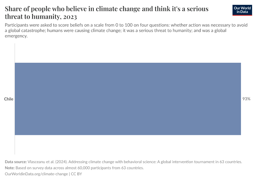 “Data Page: Share of people who believe in climate change and think it's a serious threat to humanity”. Our World in Data (2025). Data adapted from Vlasceanu et al. (2024). Addressing climate change with behavioral science: A global intervention tournament in 63 countries.. Retrieved from https://archive.ourworldindata.org/20250909-093708/grapher/share-believe-climate.html [online resource] (archived on September 9, 2025).How to cite this data