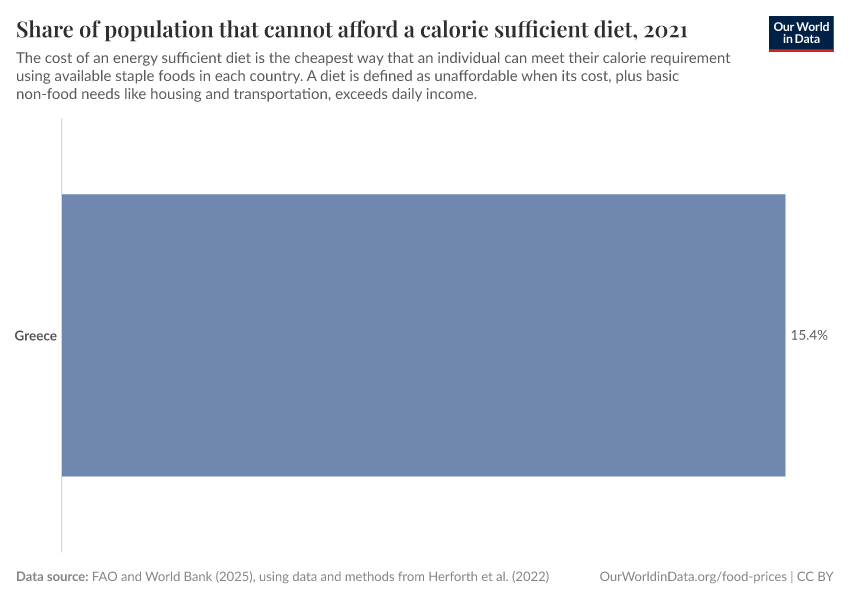 FAO and World Bank (2025), using data and methods from Herforth et al. (2022) – with minor processing by Our World in Data. “Share of population that cannot afford a calorie sufficient diet” [dataset]. Herforth et al. (2022), adapted by World Bank, “Food Prices for Nutrition 4.0” [original data]. Retrieved December 21, 2025 from https://archive.ourworldindata.org/20251013-180113/grapher/share-calorie-diet-unaffordable.html (archived on October 13, 2025).