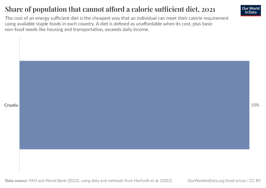 FAO and World Bank (2025), using data and methods from Herforth et al. (2022) – with minor processing by Our World in Data. “Share of population that cannot afford a calorie sufficient diet” [dataset]. Herforth et al. (2022), adapted by World Bank, “Food Prices for Nutrition 4.0” [original data]. Retrieved December 25, 2025 from https://archive.ourworldindata.org/20251013-180113/grapher/share-calorie-diet-unaffordable.html (archived on October 13, 2025).