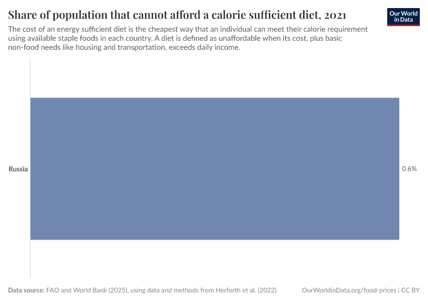 FAO and World Bank (2025), using data and methods from Herforth et al. (2022) – with minor processing by Our World in Data. “Share of population that cannot afford a calorie sufficient diet” [dataset]. Herforth et al. (2022), adapted by World Bank, “Food Prices for Nutrition 4.0” [original data]. Retrieved November 16, 2025 from https://archive.ourworldindata.org/20251013-180113/grapher/share-calorie-diet-unaffordable.html (archived on October 13, 2025).