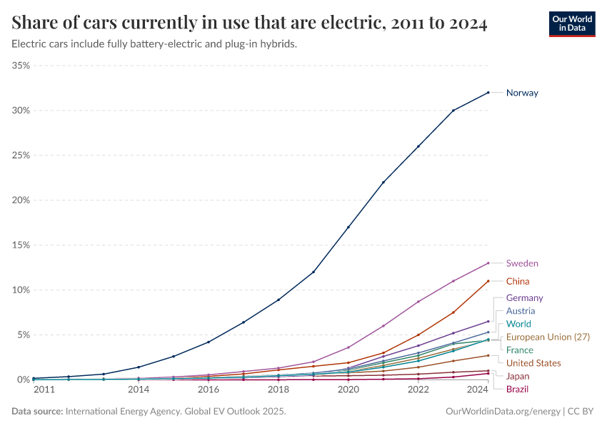 “Data Page: Share of cars currently in use that are electric”. Our World in Data (2026). Data adapted from International Energy Agency. Global EV Outlook 2025.. Retrieved from https://archive.ourworldindata.org/20250909-093708/grapher/share-car-stocks-electric.html [online resource] (archived on September 9, 2025).How to cite this data