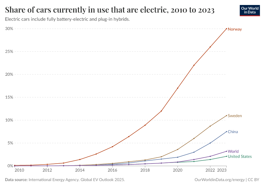 “Data Page: Share of cars currently in use that are electric”. Our World in Data (2025). Data adapted from International Energy Agency. Global EV Outlook 2025.. Retrieved from https://archive.ourworldindata.org/20250909-093708/grapher/share-car-stocks-electric.html [online resource] (archived on September 9, 2025).How to cite this data