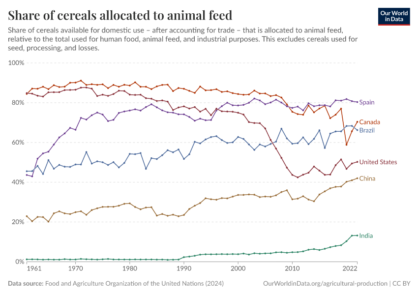 “Data Page: Share of cereals allocated to animal feed”, part of the following publication: Hannah Ritchie, Pablo Rosado, and Max Roser (2023) - “Agricultural Production”. Data adapted from Food and Agriculture Organization of the United Nations. Retrieved from https://archive.ourworldindata.org/20251014-163147/grapher/share-cereals-animal-feed.html [online resource] (archived on October 14, 2025).