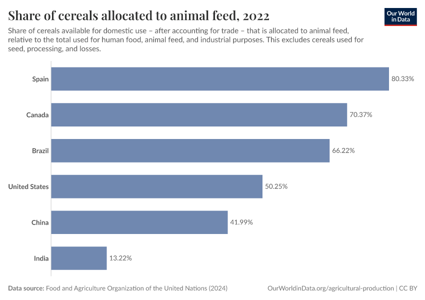 “Data Page: Share of cereals allocated to animal feed”, part of the following publication: Hannah Ritchie, Pablo Rosado, and Max Roser (2023) - “Agricultural Production”. Data adapted from Food and Agriculture Organization of the United Nations. Retrieved from https://archive.ourworldindata.org/20251014-163147/grapher/share-cereals-animal-feed.html [online resource] (archived on October 14, 2025).