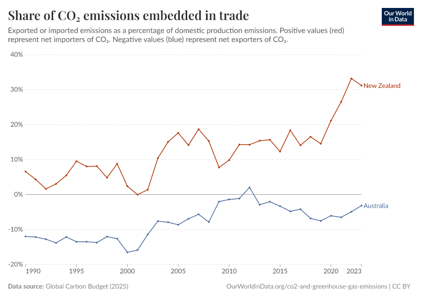 “Data Page: Share of CO₂ emissions embedded in trade”, part of the following publication: Hannah Ritchie, Pablo Rosado, and Max Roser (2023) - “CO₂ and Greenhouse Gas Emissions”. Data adapted from Global Carbon Project. Retrieved from https://archive.ourworldindata.org/20251204-133459/grapher/share-co2-embedded-in-trade.html [online resource] (archived on December 4, 2025).