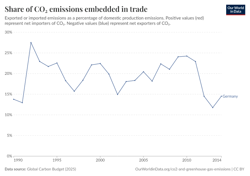 “Data Page: Share of CO₂ emissions embedded in trade”, part of the following publication: Hannah Ritchie, Pablo Rosado, and Max Roser (2023) - “CO₂ and Greenhouse Gas Emissions”. Data adapted from Global Carbon Project. Retrieved from https://archive.ourworldindata.org/20260417-112857/grapher/share-co2-embedded-in-trade.html [online resource] (archived on April 17, 2026).