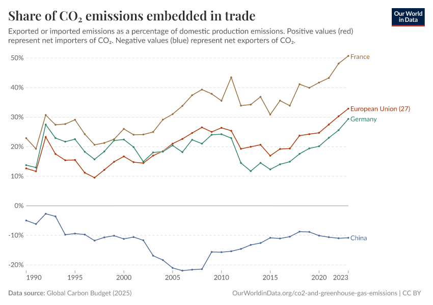 Global Carbon Budget (2025) – with major processing by Our World in Data. “Share of CO₂ emissions embedded in trade” [dataset]. Global Carbon Project, “Global Carbon Budget v15” [original data]. Retrieved December 31, 2025 from https://archive.ourworldindata.org/20251204-133459/grapher/share-co2-embedded-in-trade.html (archived on December 4, 2025).