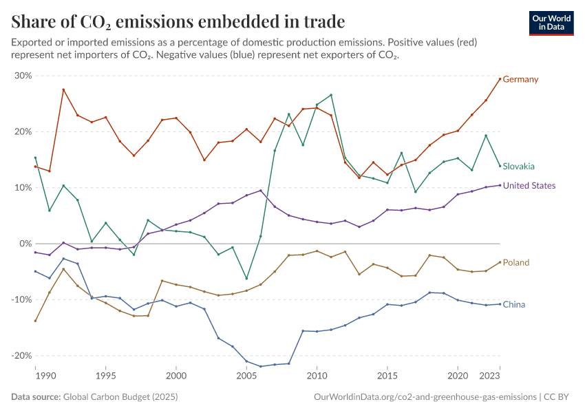“Data Page: Share of CO₂ emissions embedded in trade”, part of the following publication: Hannah Ritchie, Pablo Rosado, and Max Roser (2023) - “CO₂ and Greenhouse Gas Emissions”. Data adapted from Global Carbon Project. Retrieved from https://archive.ourworldindata.org/20251204-133459/grapher/share-co2-embedded-in-trade.html [online resource] (archived on December 4, 2025).How to cite this data