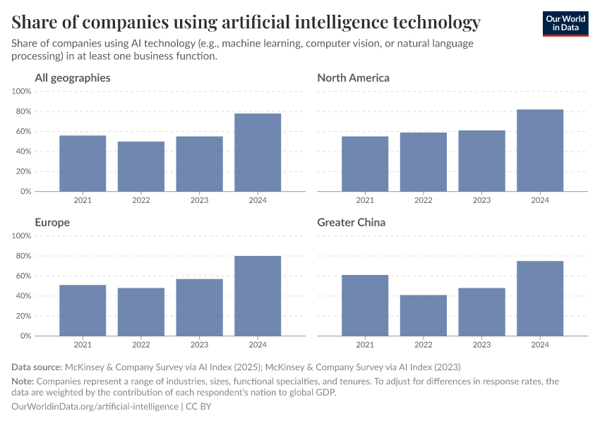 “Data Page: Share of companies using artificial intelligence technology”, part of the following publication: Charlie Giattino, Edouard Mathieu, Veronika Samborska, and Max Roser (2023) - “Artificial Intelligence”. Data adapted from McKinsey & Company Survey via AI Index. Retrieved from https://archive.ourworldindata.org/20250909-093708/grapher/share-companies-using-artificial-intelligence.html [online resource] (archived on September 9, 2025).How to cite this data