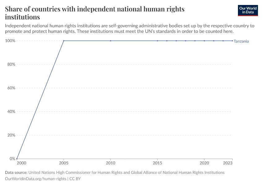 “Data Page: Share of countries with independent national human rights institutions”. Our World in Data (2025). Data adapted from United Nations High Commissioner for Human Rights and Global Alliance of National Human Rights Institutions. Retrieved from https://archive.ourworldindata.org/20251125-165536/grapher/share-countries-accredited-independent-national-human-rights-institutions.html [online resource] (archived on November 25, 2025).