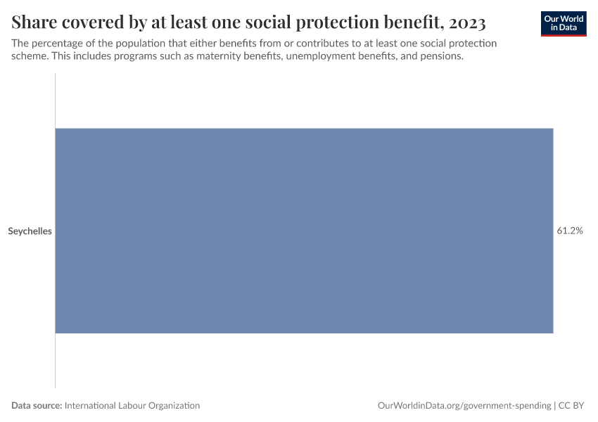 “Data Page: Share covered by at least one social protection benefit”. Our World in Data (2026). Data adapted from International Labour Organization. Retrieved from https://archive.ourworldindata.org/20251125-165536/grapher/share-covered-by-one-social-protection-benefit.html [online resource] (archived on November 25, 2025).How to cite this data