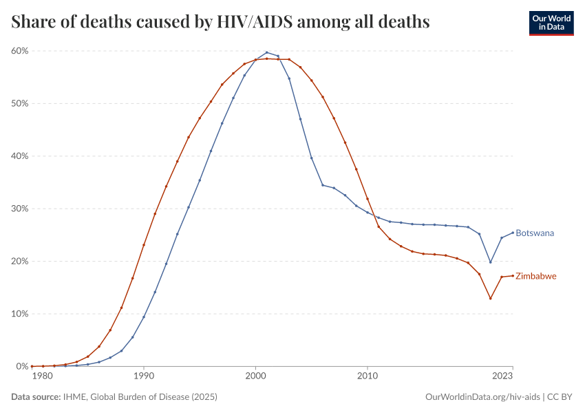 “Data Page: Share of deaths caused by HIV/AIDS among all deaths”, part of the following publication: Esteban Ortiz-Ospina and Max Roser (2016) - “Global Health”. Data adapted from IHME, Global Burden of Disease. Retrieved from https://archive.ourworldindata.org/20260323-161325/grapher/share-deaths-aids.html [online resource] (archived on March 23, 2026).How to cite this data