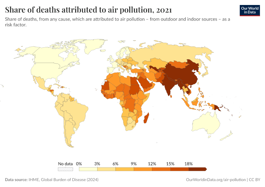 IHME, Global Burden of Disease (2024) – with minor processing by Our World in Data. “Share of deaths attributed to air pollution” [dataset]. IHME, Global Burden of Disease, “Global Burden of Disease - Risk Factors” [original data]. Retrieved December 8, 2025 from https://archive.ourworldindata.org/20250909-093708/grapher/share-deaths-air-pollution.html (archived on September 9, 2025).