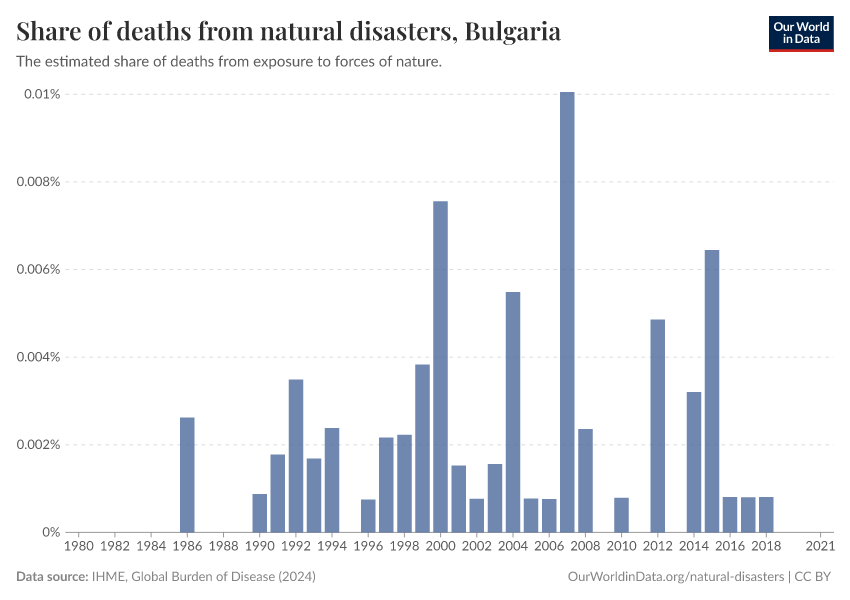 “Data Page: Share of deaths from natural disasters”, part of the following publication: Esteban Ortiz-Ospina and Max Roser (2016) - “Global Health”. Data adapted from IHME, Global Burden of Disease. Retrieved from https://archive.ourworldindata.org/20250909-093708/grapher/share-deaths-from-natural-disasters.html [online resource] (archived on September 9, 2025).How to cite this data