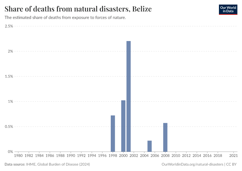 IHME, Global Burden of Disease (2024) – with minor processing by Our World in Data. “Share of deaths from natural disasters” [dataset]. IHME, Global Burden of Disease, “Global Burden of Disease - Deaths and DALYs” [original data]. Retrieved December 22, 2025 from https://archive.ourworldindata.org/20250909-093708/grapher/share-deaths-from-natural-disasters.html (archived on September 9, 2025).