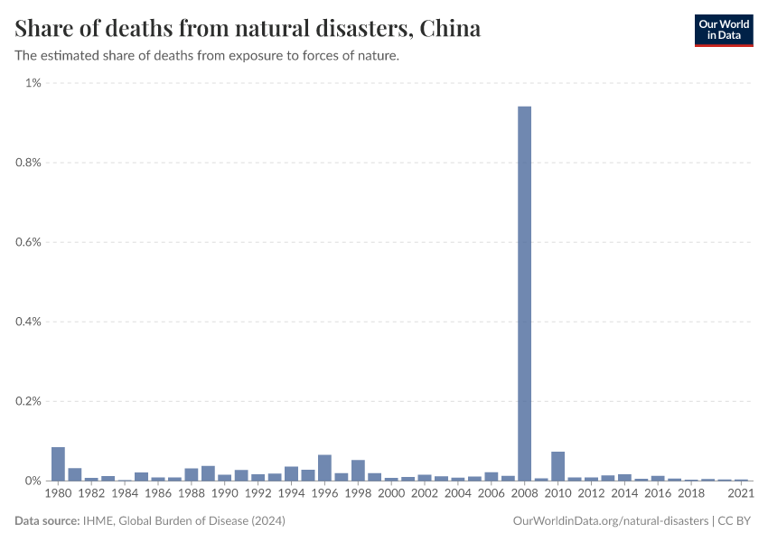 “Data Page: Share of deaths from natural disasters”, part of the following publication: Esteban Ortiz-Ospina and Max Roser (2016) - “Global Health”. Data adapted from IHME, Global Burden of Disease. Retrieved from https://archive.ourworldindata.org/20250909-093708/grapher/share-deaths-from-natural-disasters.html [online resource] (archived on September 9, 2025).
