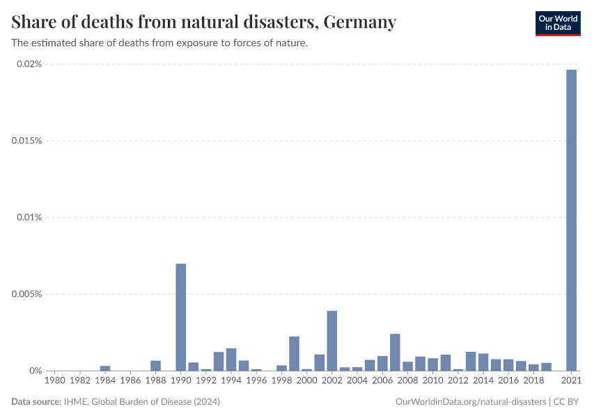 IHME, Global Burden of Disease (2024) – with minor processing by Our World in Data. “Share of deaths from natural disasters” [dataset]. IHME, Global Burden of Disease, “Global Burden of Disease - Deaths and DALYs” [original data]. Retrieved December 30, 2025 from https://archive.ourworldindata.org/20250909-093708/grapher/share-deaths-from-natural-disasters.html (archived on September 9, 2025).