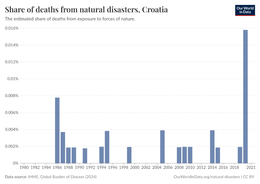 IHME, Global Burden of Disease (2024) – with minor processing by Our World in Data. “Share of deaths from natural disasters” [dataset]. IHME, Global Burden of Disease, “Global Burden of Disease - Deaths and DALYs” [original data]. Retrieved December 27, 2025 from https://archive.ourworldindata.org/20250909-093708/grapher/share-deaths-from-natural-disasters.html (archived on September 9, 2025).