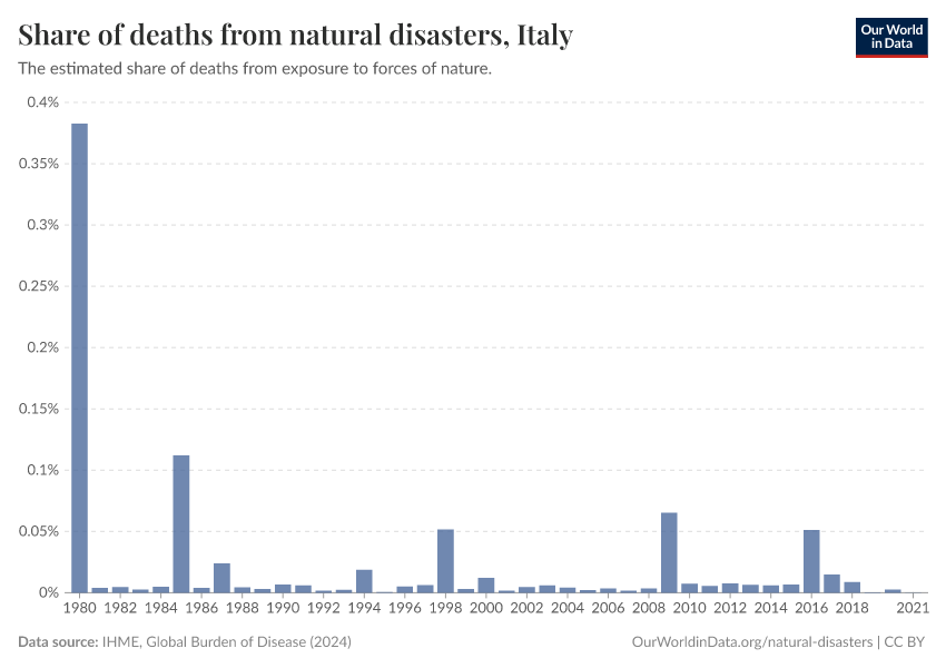 “Data Page: Share of deaths from natural disasters”, part of the following publication: Esteban Ortiz-Ospina and Max Roser (2016) - “Global Health”. Data adapted from IHME, Global Burden of Disease. Retrieved from https://archive.ourworldindata.org/20250909-093708/grapher/share-deaths-from-natural-disasters.html [online resource] (archived on September 9, 2025).How to cite this data