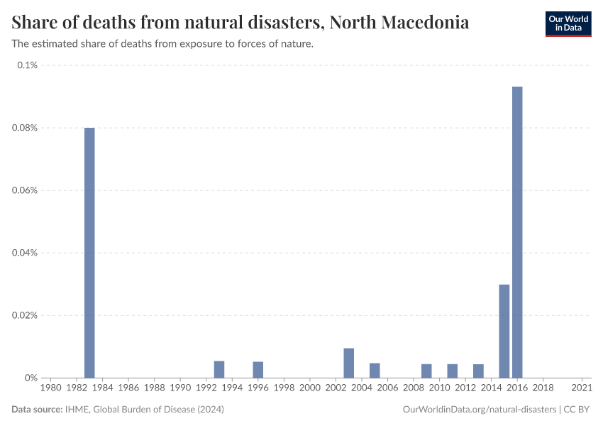 “Data Page: Share of deaths from natural disasters”, part of the following publication: Esteban Ortiz-Ospina and Max Roser (2016) - “Global Health”. Data adapted from IHME, Global Burden of Disease. Retrieved from https://archive.ourworldindata.org/20250909-093708/grapher/share-deaths-from-natural-disasters.html [online resource] (archived on September 9, 2025).