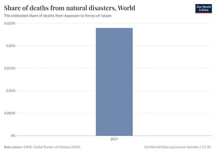 IHME, Global Burden of Disease (2024) – with minor processing by Our World in Data. “Share of deaths from natural disasters” [dataset]. IHME, Global Burden of Disease, “Global Burden of Disease - Deaths and DALYs” [original data]. Retrieved December 28, 2025 from https://archive.ourworldindata.org/20250909-093708/grapher/share-deaths-from-natural-disasters.html (archived on September 9, 2025).
