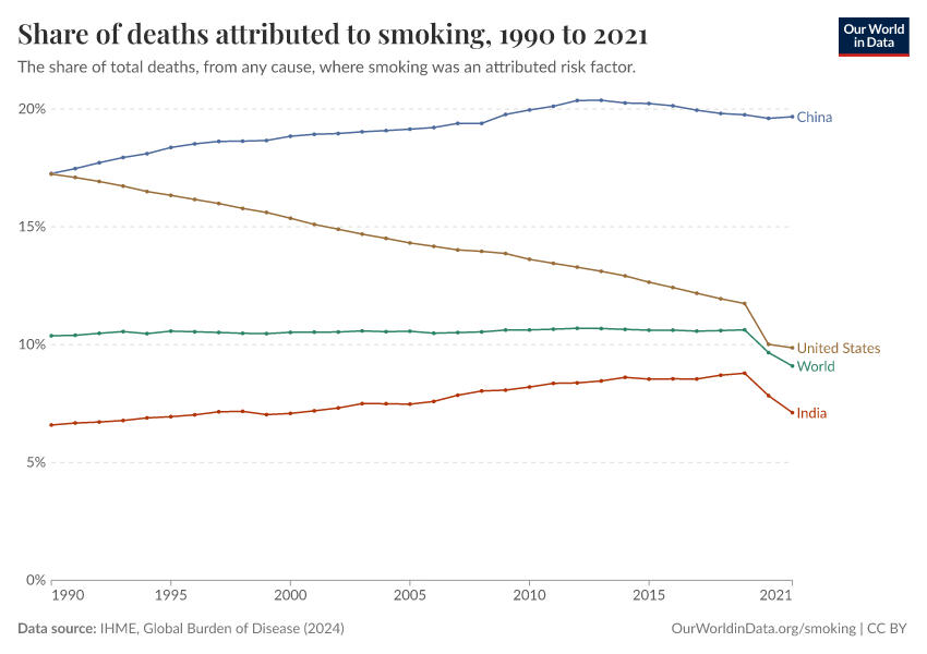 “Data Page: Share of deaths attributed to smoking”, part of the following publication: Esteban Ortiz-Ospina and Max Roser (2016) - “Global Health”. Data adapted from IHME, Global Burden of Disease. Retrieved from https://archive.ourworldindata.org/20250909-093708/grapher/share-deaths-smoking.html [online resource] (archived on September 9, 2025).How to cite this data