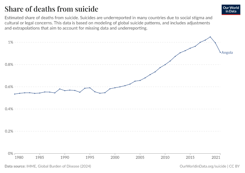IHME, Global Burden of Disease (2024) – with minor processing by Our World in Data. “Share of deaths from suicide” [dataset]. IHME, Global Burden of Disease, “Global Burden of Disease - Deaths and DALYs” [original data]. Retrieved December 6, 2025 from https://archive.ourworldindata.org/20250909-093708/grapher/share-deaths-suicide.html (archived on September 9, 2025).